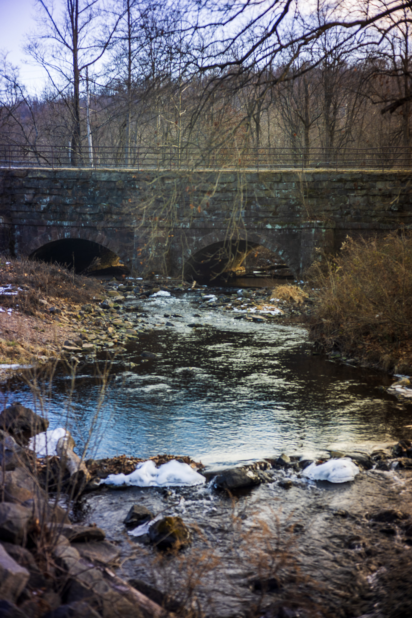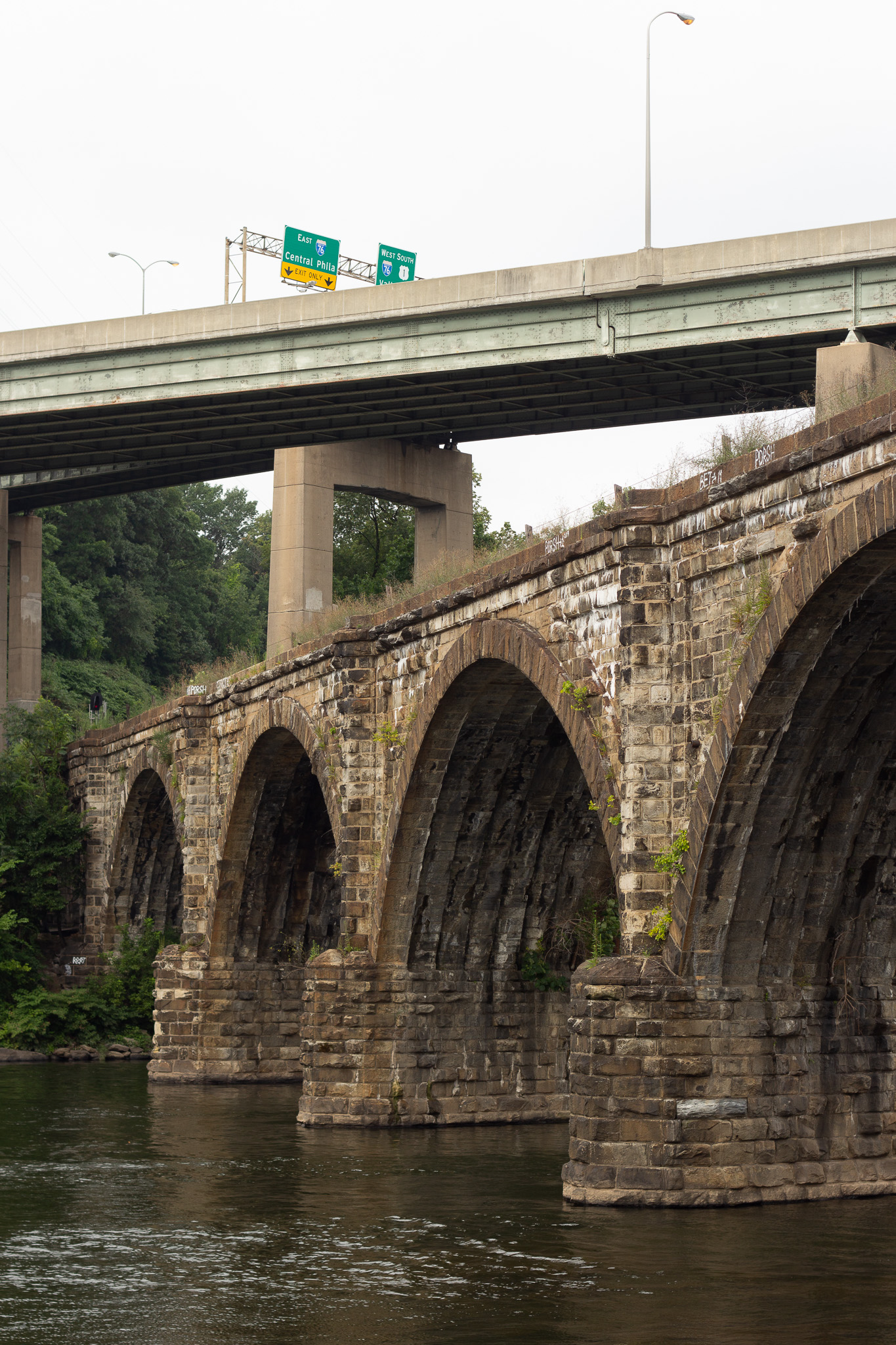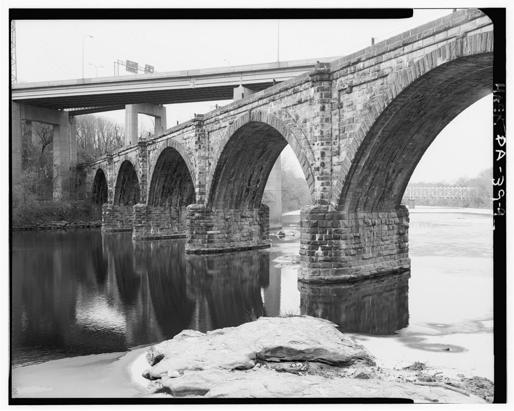 The Falls Bridge is an early and ambitious implementation of the "false skew" method of stone arch construction, first used on an American railroad by the Philadelphia & Reading Railroad in 1848.